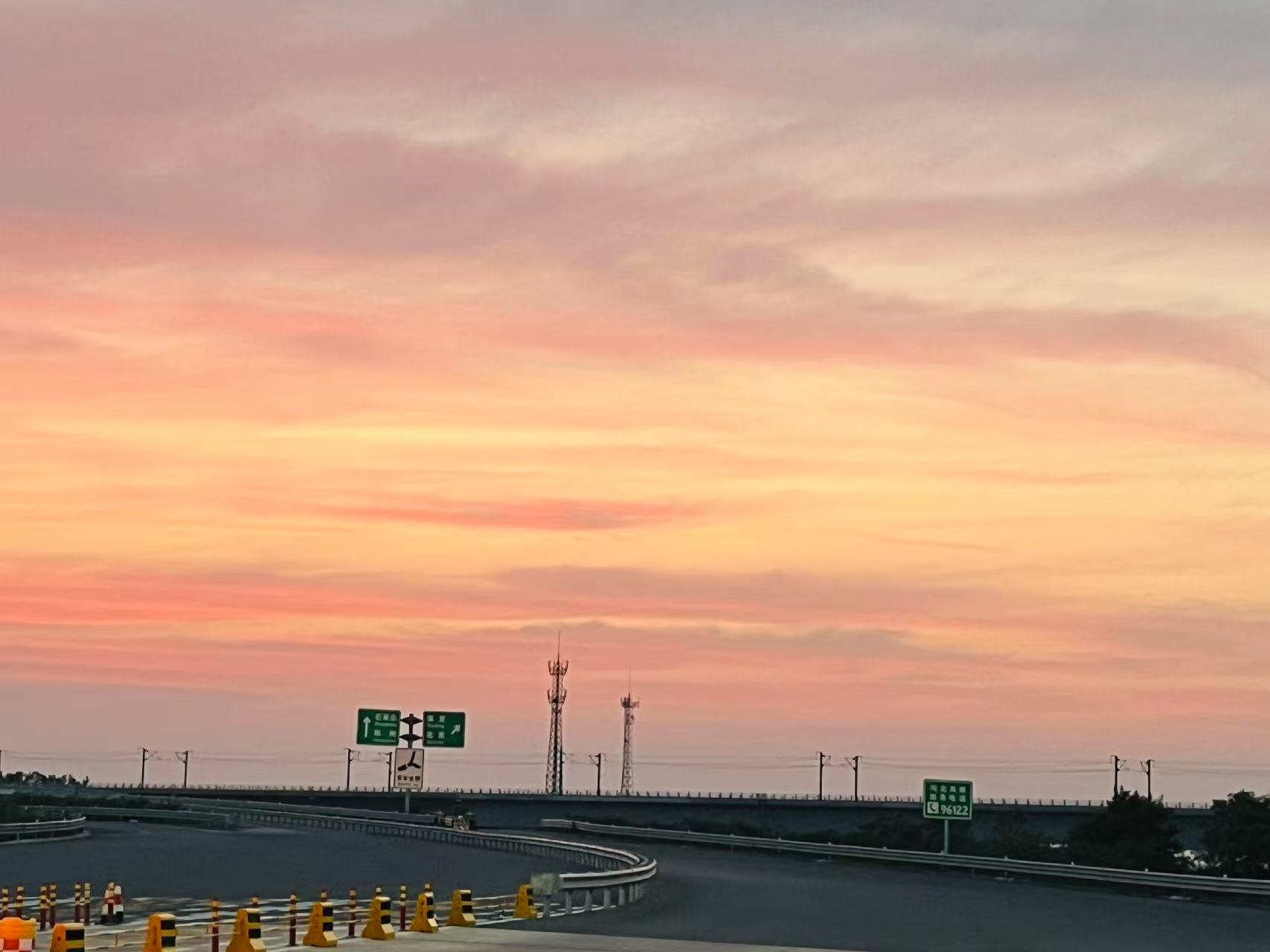 忽然间,一抹绚丽的红色闯入眼帘。抬头望去,整片天空都被晚霞染成了橘红色,云层像被火烧着似的,边缘泛着金色的光芒。远处的群山在霞光中若隐若现,勾勒出一道温柔的剪影。收费站顶棚的金属支架在夕阳下闪闪发亮,投下长长的影子。